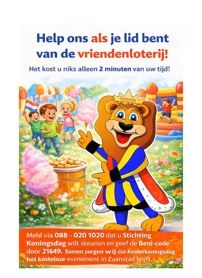 Samen zorgen we ervoor dat KinderKoningsdag een gratis evenement blijft voor alle kinderen in Zaanstad โ met spelletjes, springkussens, poffertjes, suikerspin en vooral heel veel plezier ๐ฅณ๐
